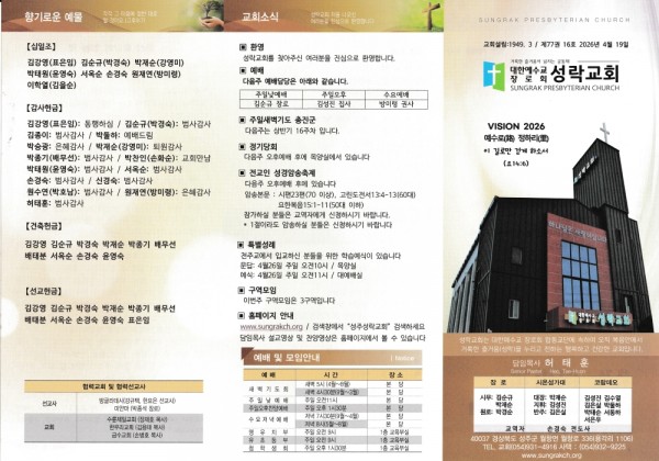 2026년 4월19일 주보 페이지 정보 작성자 하나냐 댓글 0건 조회 17회 작성일 26-04-18 17:51 목록 본문 2026년 4월19일 주보 다음글2026년 4월12일 주보 26.04.11 댓글 0 댓글목록 등록된 댓글이 없습니다.